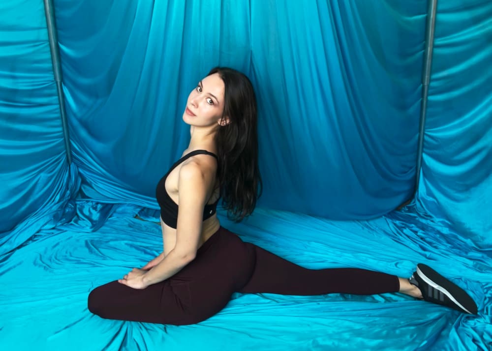 You don’t need to be able to do the splits to train like an aerialist! Try the stag stretch for a beautiful pose that also increases your hip mobility. Bend one knee out in front of you while extending the other leg behind you. If you want to add an arm and shoulder stretch, try bending your back leg and hooking it with your elbow. Bring your other elbow towards the ceiling and try to touch your back with your hand. Try holding this pose for about 30 seconds. Remember that flexibility takes time and consistency!
