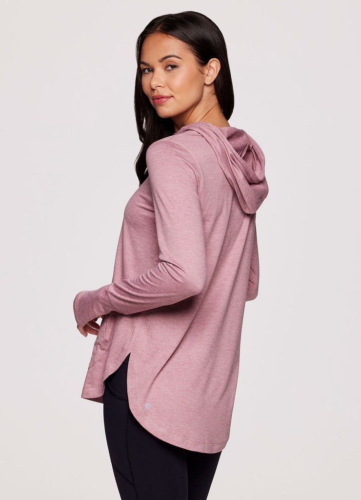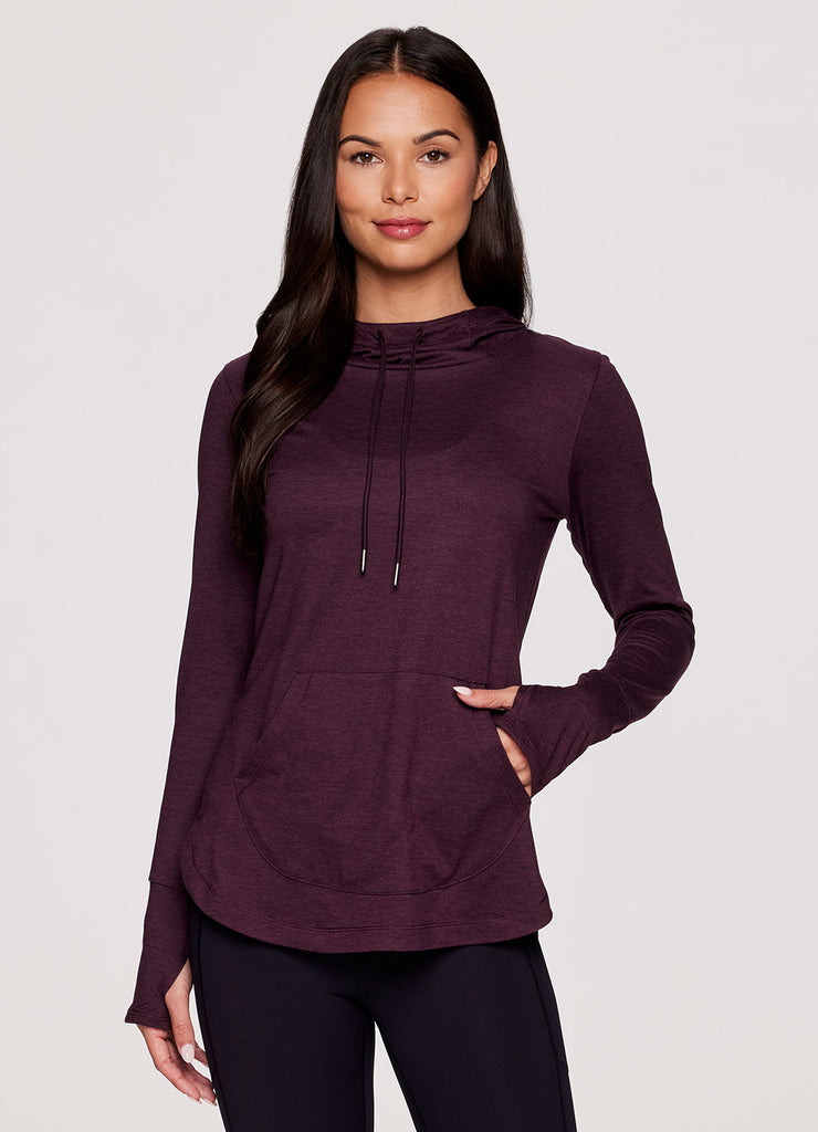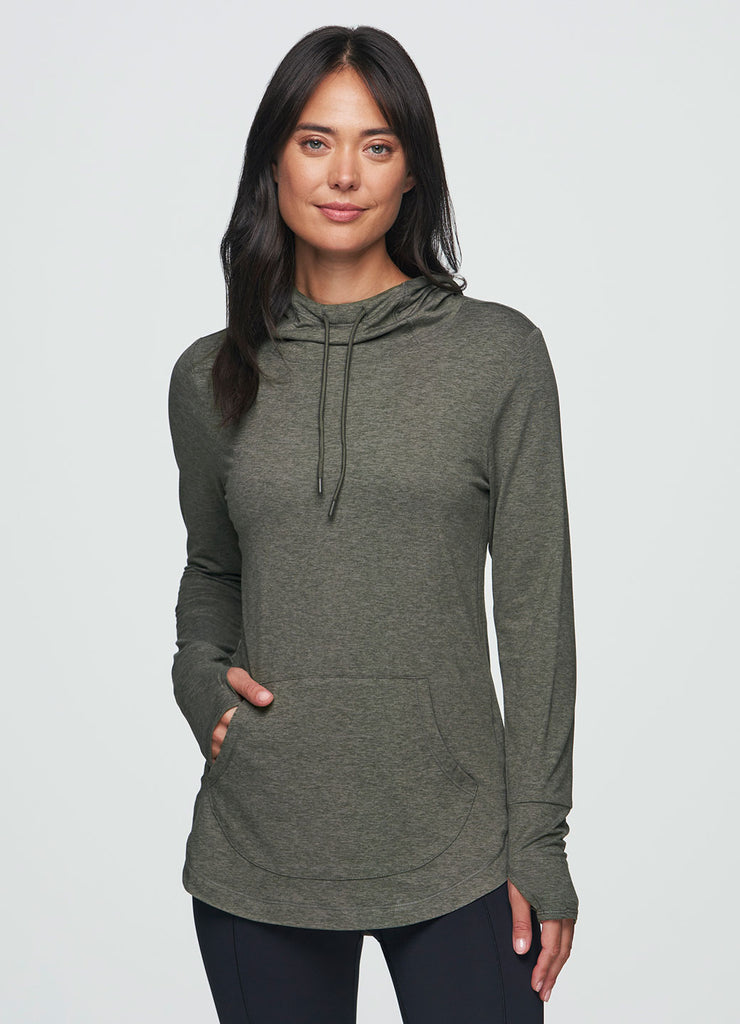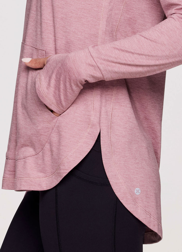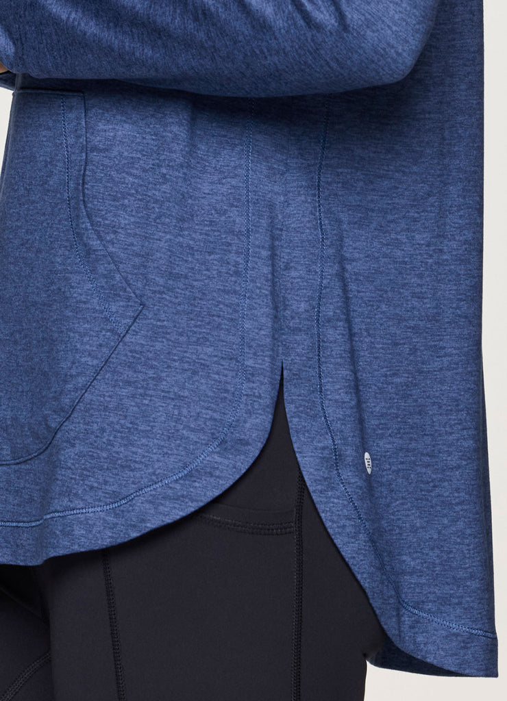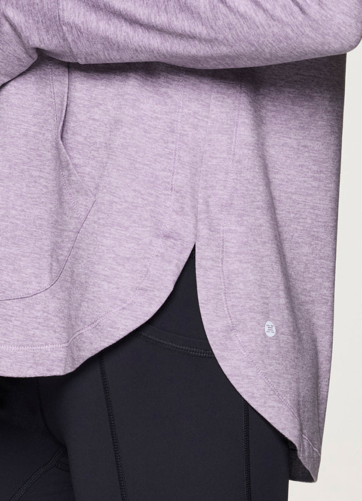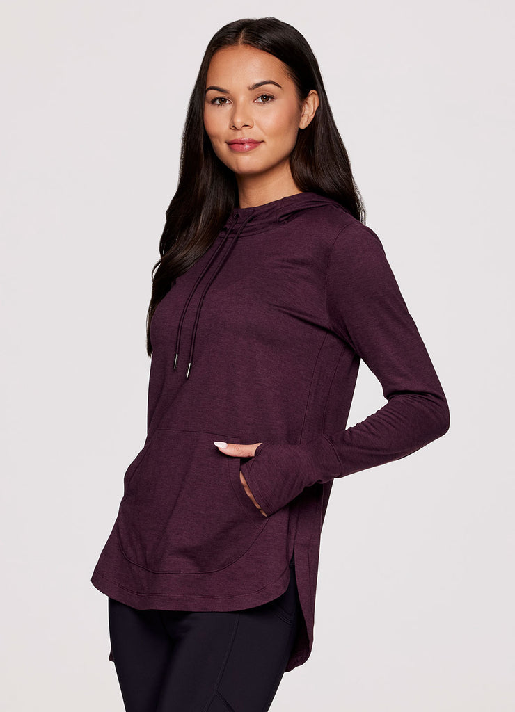 The lightweight Studio Breathe Super Soft Hoodie Tunic is constructed from our upgraded EverydaySoft peached jersey fabric for supreme comfort. The attached hood comes equipped with adjustable drawstrings, plus thumbholes at the wrists help enhance mobility while keeping sleeves in place. Its shaped silhouette is accentuated by side slits and a curved hemline for a feminine and flattering look. Complete with a convenient front pocket to place your phone, keys or hands, this functional hoodie top is a must-have for athleisure wardrobe!