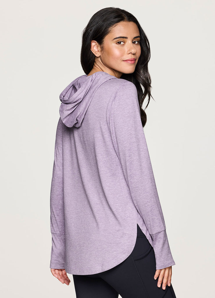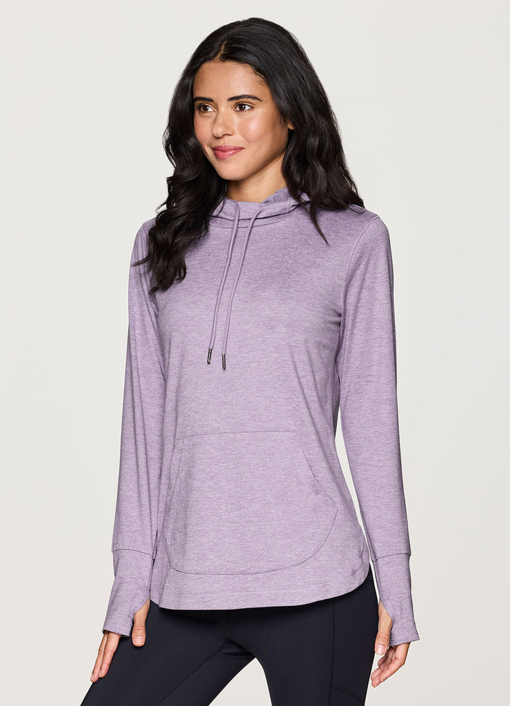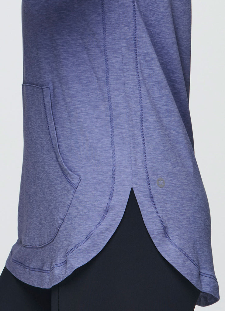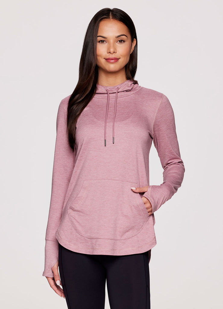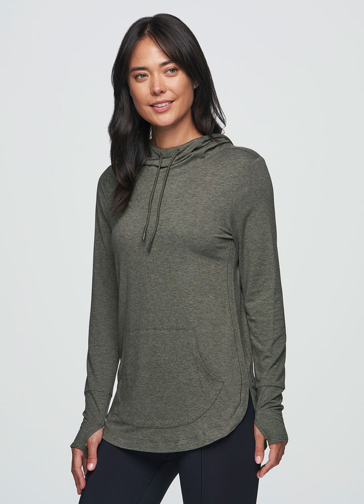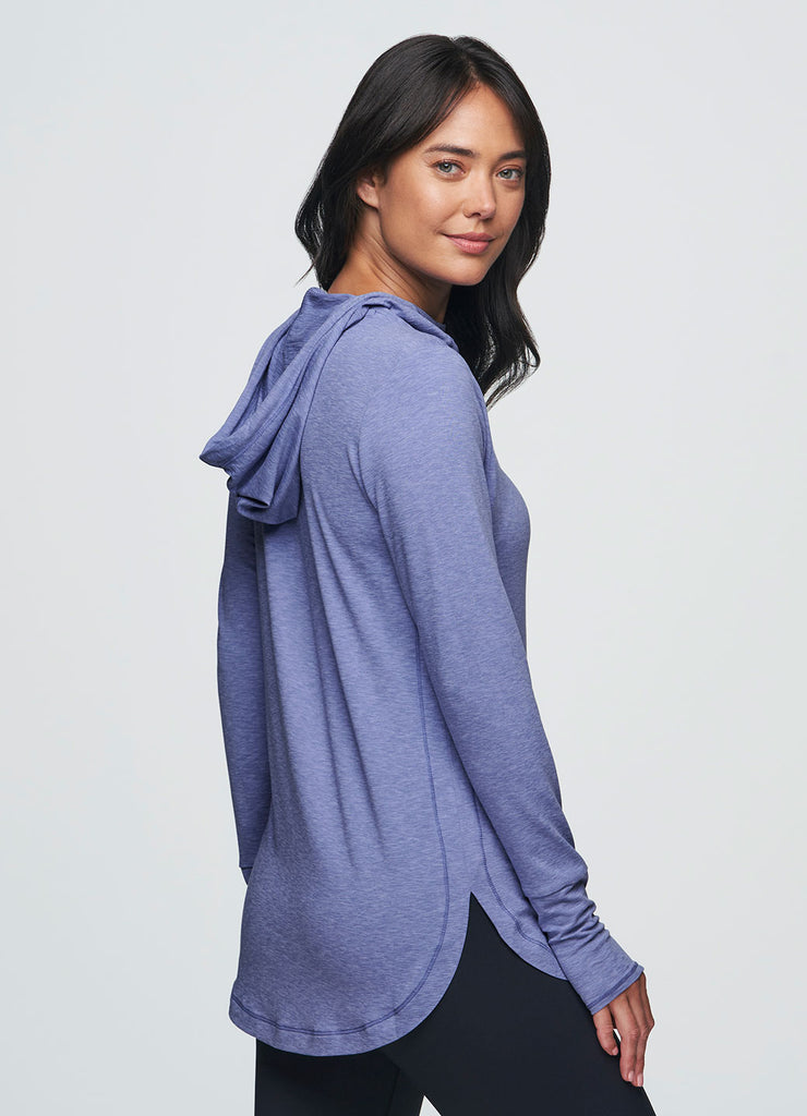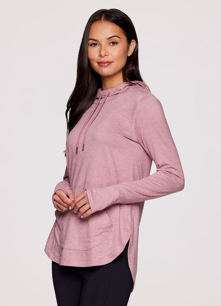The lightweight Studio Breathe Super Soft Hoodie Tunic is constructed from our upgraded EverydaySoft peached jersey fabric for supreme comfort. The attached hood comes equipped with adjustable drawstrings, plus thumbholes at the wrists help enhance mobility while keeping sleeves in place. Its shaped silhouette is accentuated by side slits and a curved hemline for a feminine and flattering look. Complete with a convenient front pocket to place your phone, keys or hands, this functional hoodie top is a must-have for athleisure wardrobe!