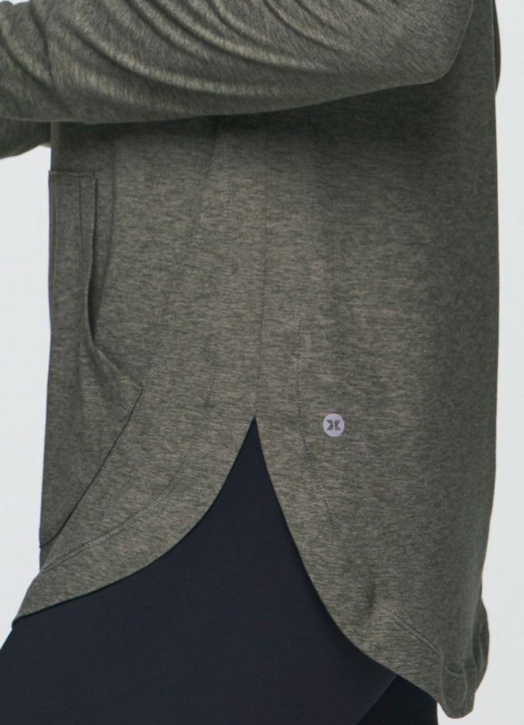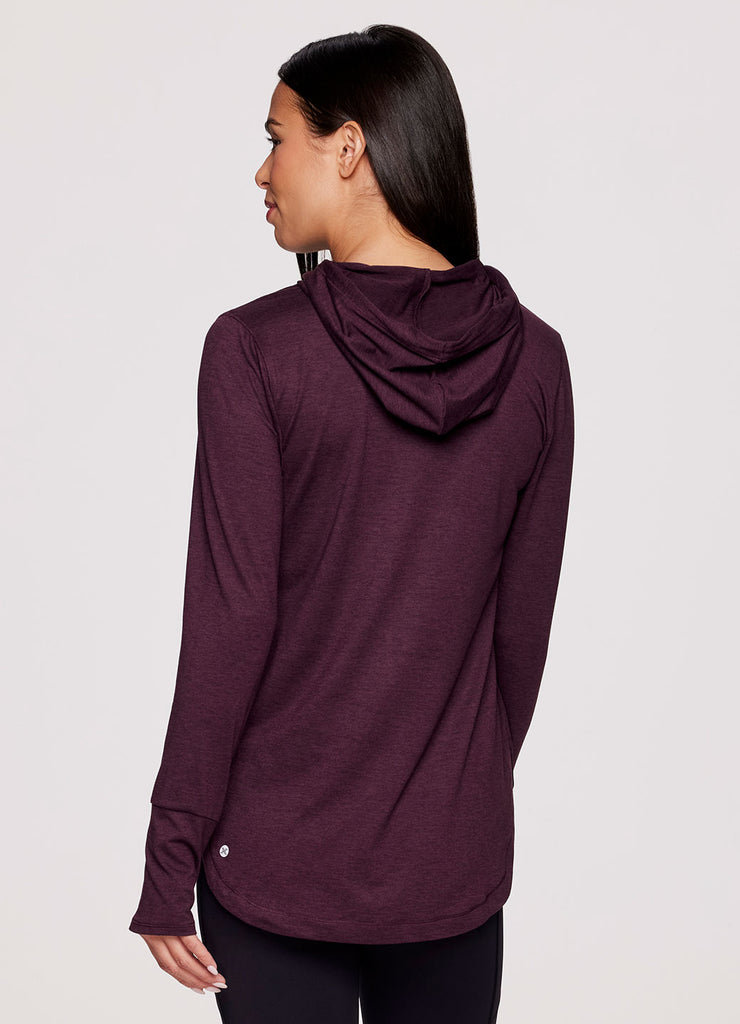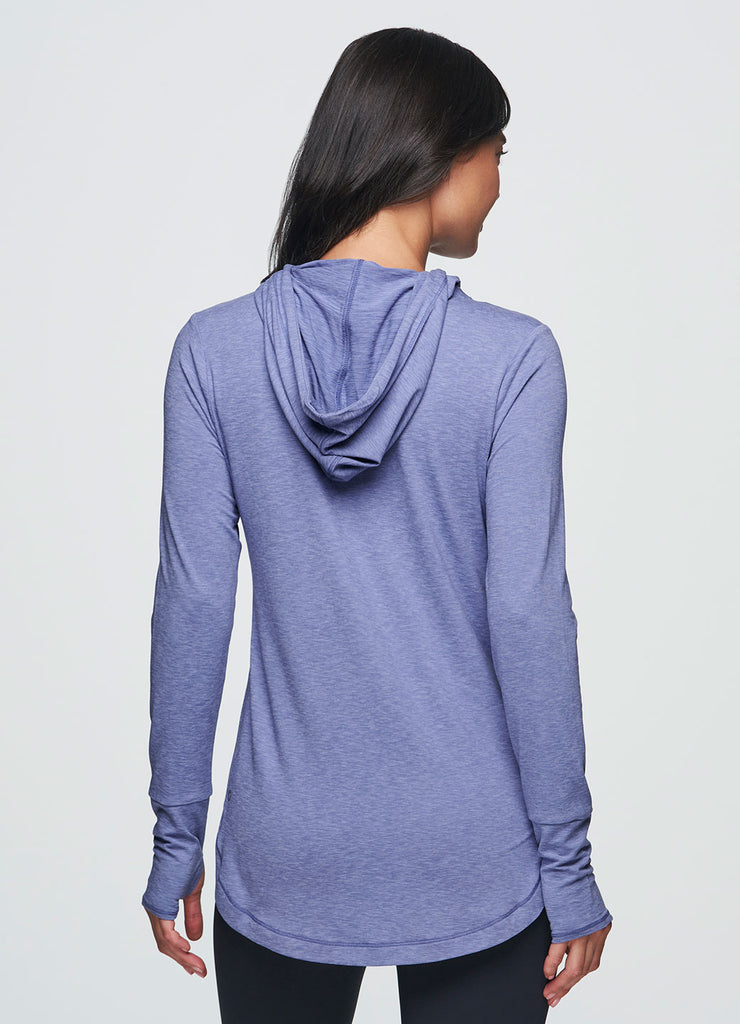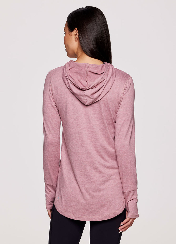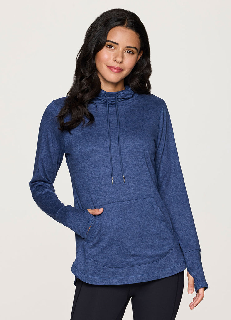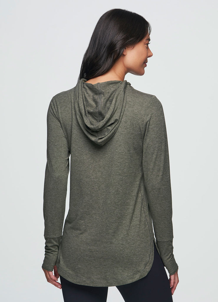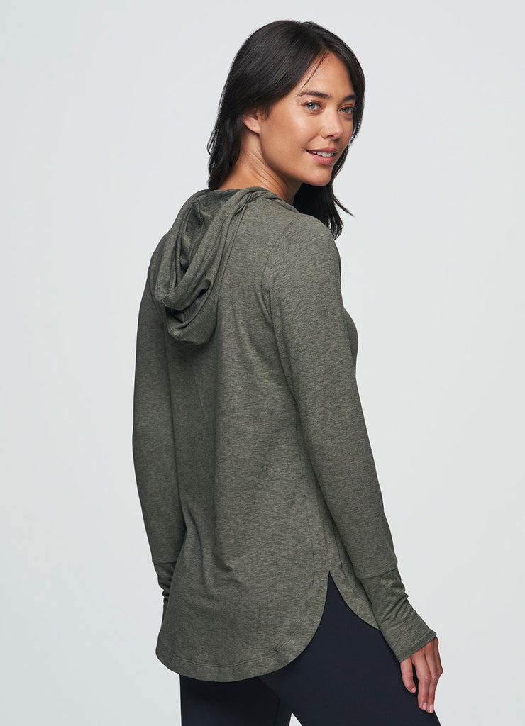 The lightweight Studio Breathe Super Soft Hoodie Tunic is constructed from our upgraded EverydaySoft peached jersey fabric for supreme comfort. The attached hood comes equipped with adjustable drawstrings, plus thumbholes at the wrists help enhance mobility while keeping sleeves in place. Its shaped silhouette is accentuated by side slits and a curved hemline for a feminine and flattering look. Complete with a convenient front pocket to place your phone, keys or hands, this functional hoodie top is a must-have for athleisure wardrobe!