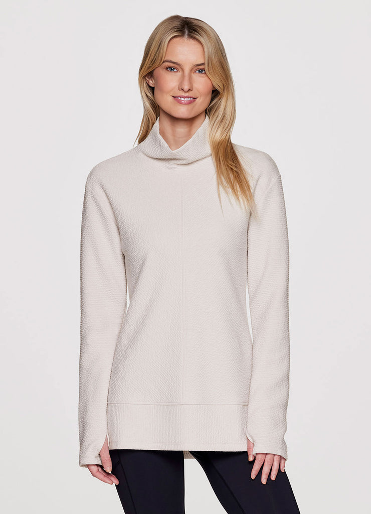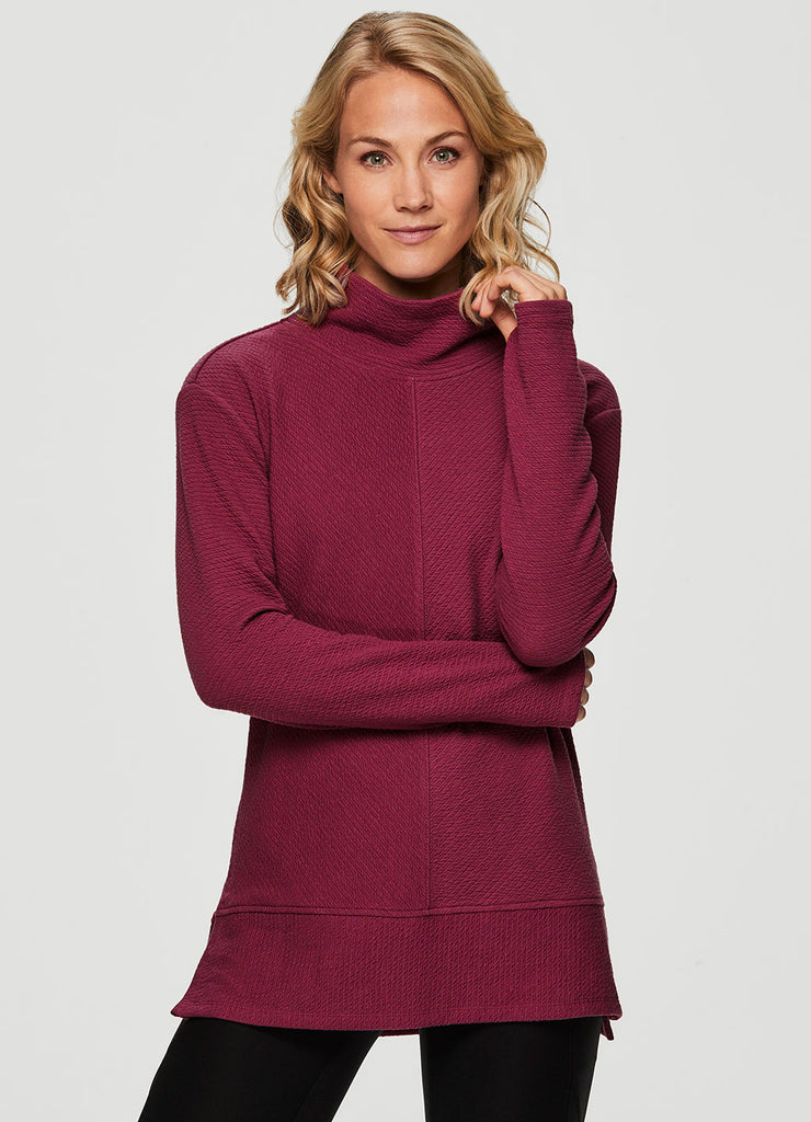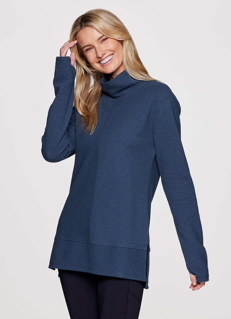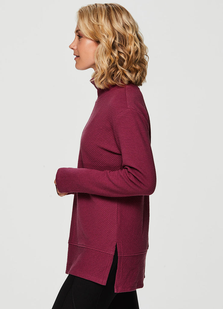 Comfort is a given in the Studio Jacquard Mock Neck Pullover sweatshirt from RBX. Featuring a tunic length for extra coverage and side slits for added comfort and a flattering fit, wear this sweater by itself at the studio or layer up and take it to the streets. With a mock neck design and thumb holes to keep the sleeves in place (or chilly hands), you’ll stay comfy, casual and stylish wherever you go.