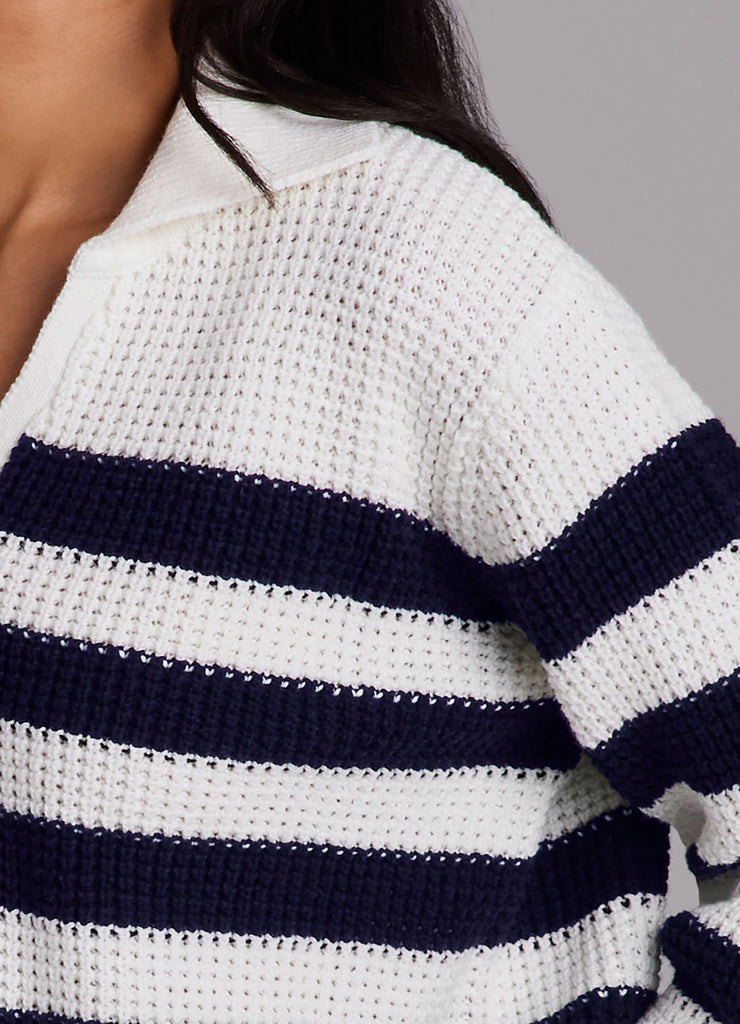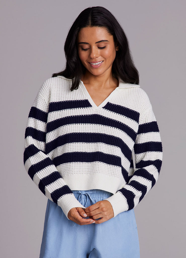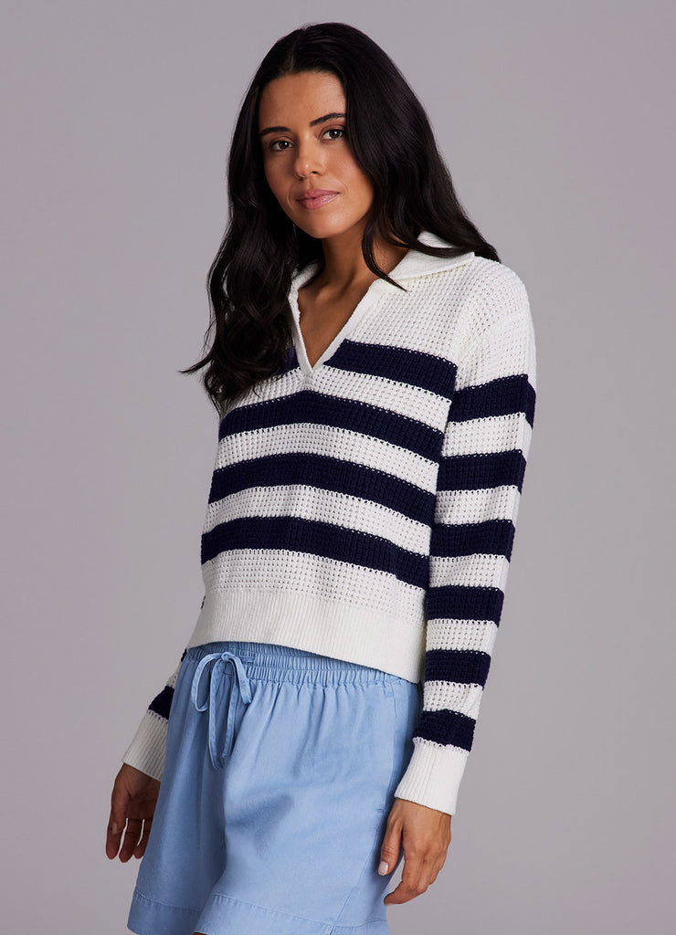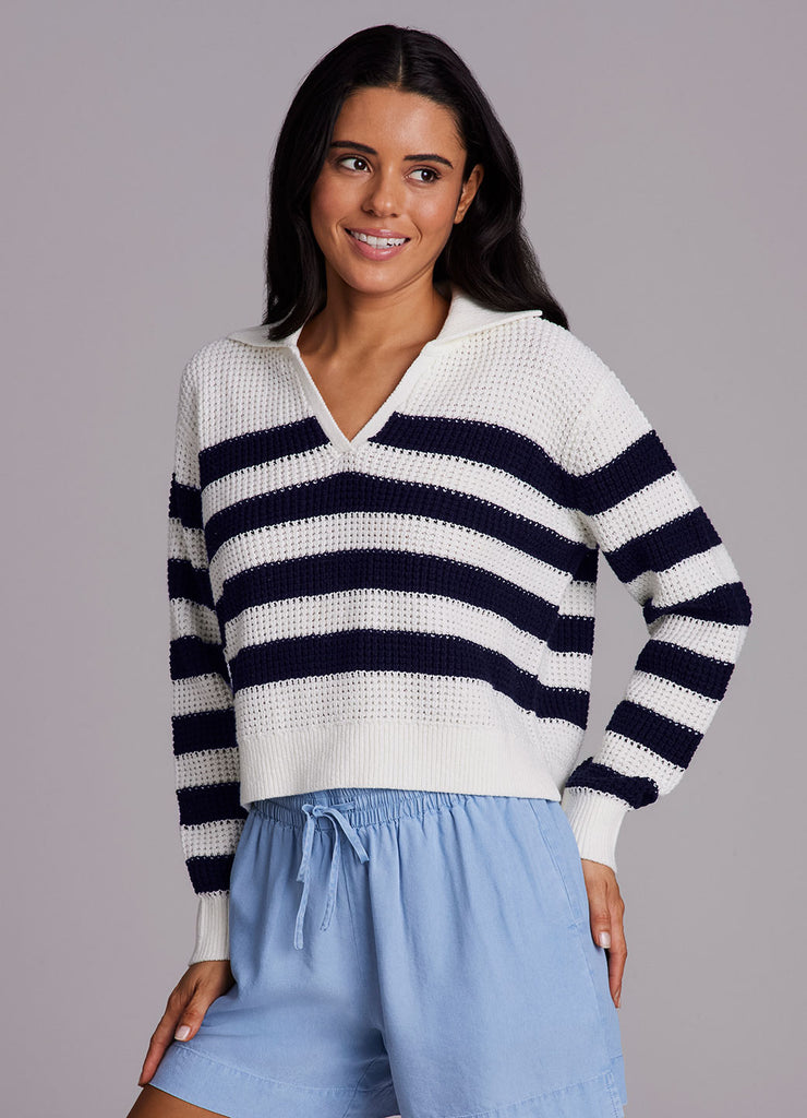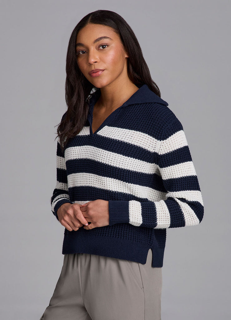 Featuring a classic striped pattern with a collared v-neck design, the Marina Striped Sweater is your go-to piece for effortless, versatile styling at any time of the year. This transitional lightweight sweater is made from a breathable cotton blend fabric that keeps you comfortable whether you're layering or wearing it solo. A boxy relaxed fit combines with a slightly cropped length and collared neckline for an elevated, modern silhouette that can be dressed up or down and pairs perfectly with your favorite skort, jeans or trousers.