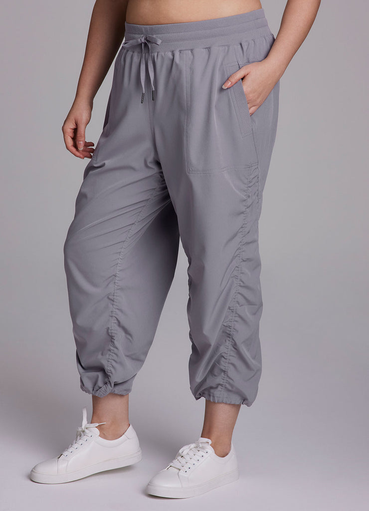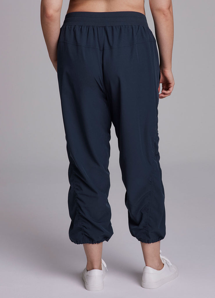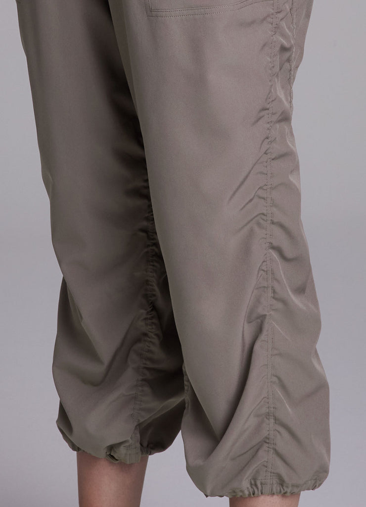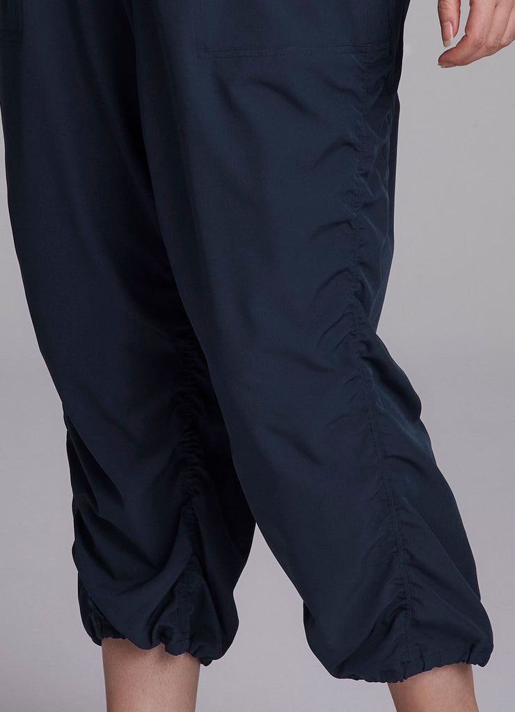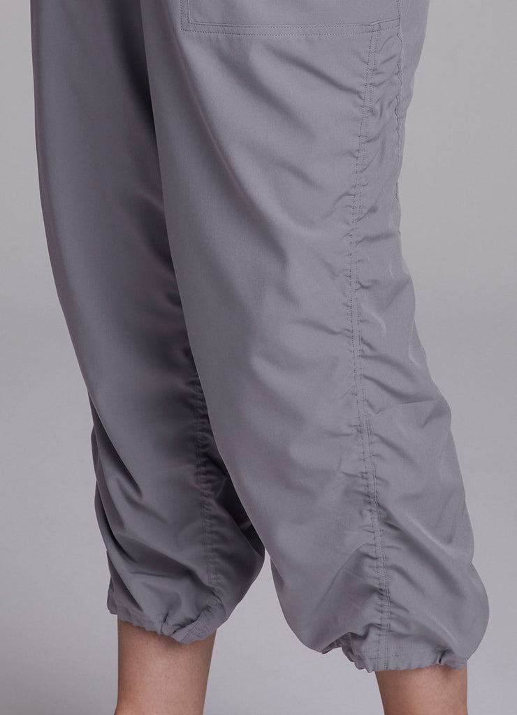 Elastic drawstring waistband and adjustable leg openings allow for a more customized fit