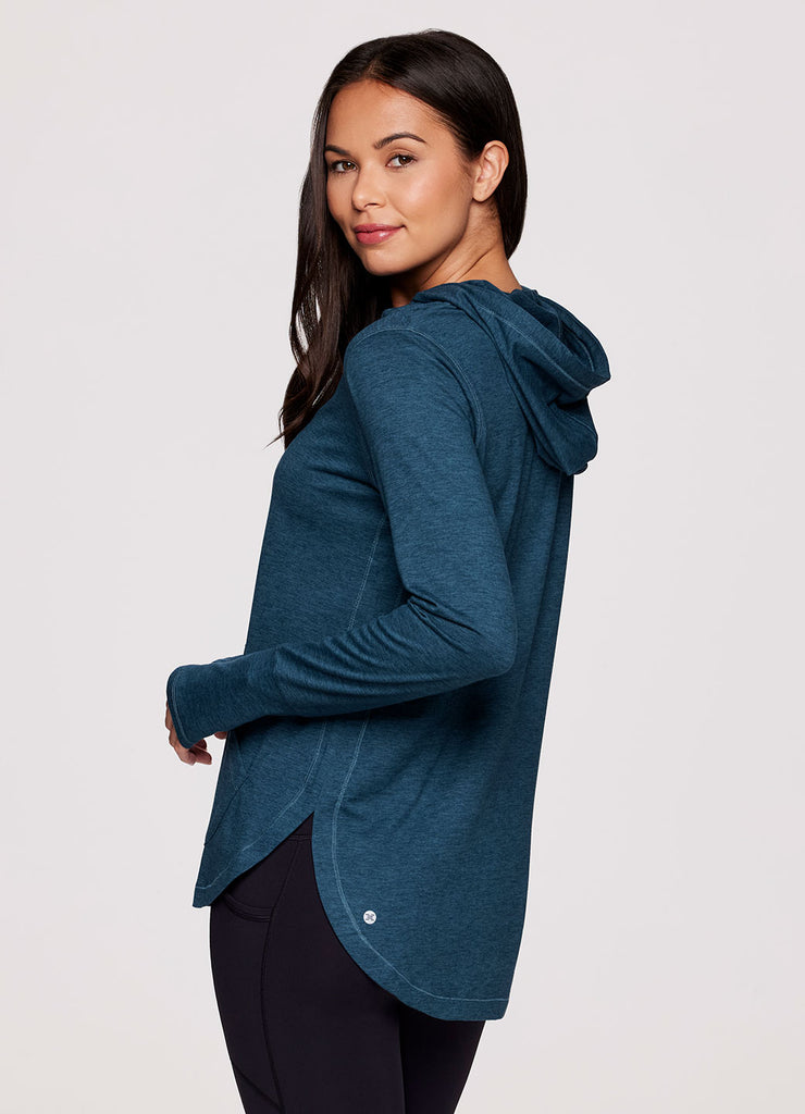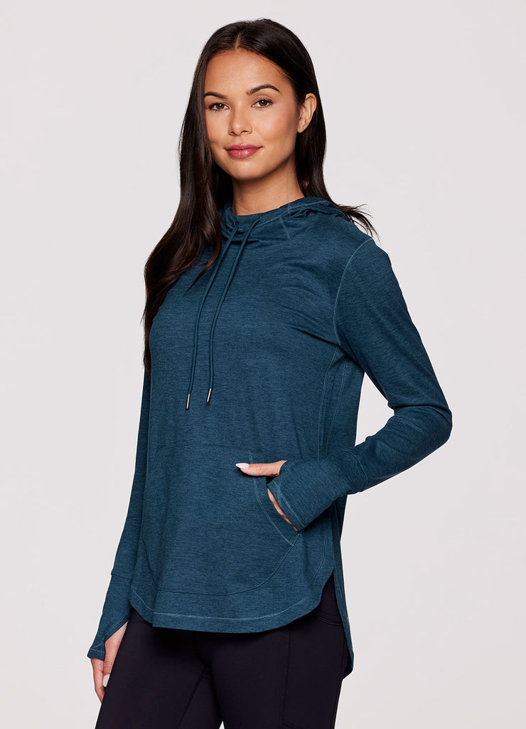 The lightweight Studio Breathe Super Soft Hoodie Tunic is constructed from our upgraded EverydaySoft peached jersey fabric for supreme comfort. The attached hood comes equipped with adjustable drawstrings, plus thumbholes at the wrists help enhance mobility while keeping sleeves in place. Its shaped silhouette is accentuated by side slits and a curved hemline for a feminine and flattering look. Complete with a convenient front pocket to place your phone, keys or hands, this functional hoodie top is a must-have for athleisure wardrobe!