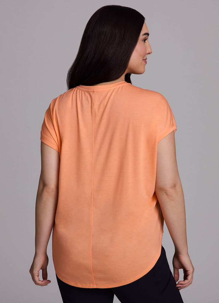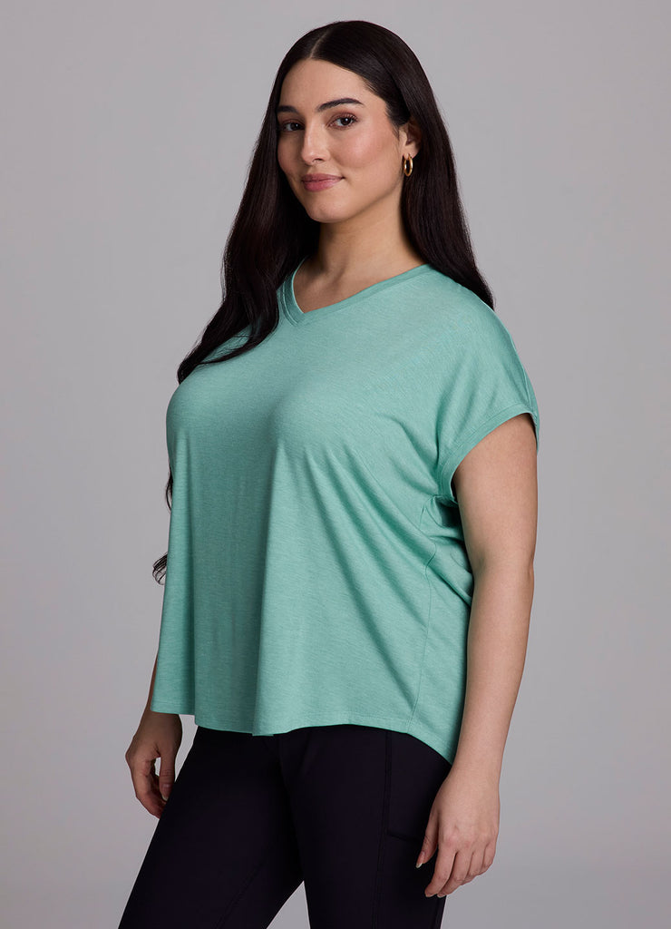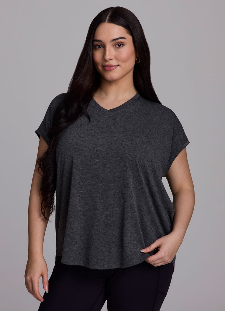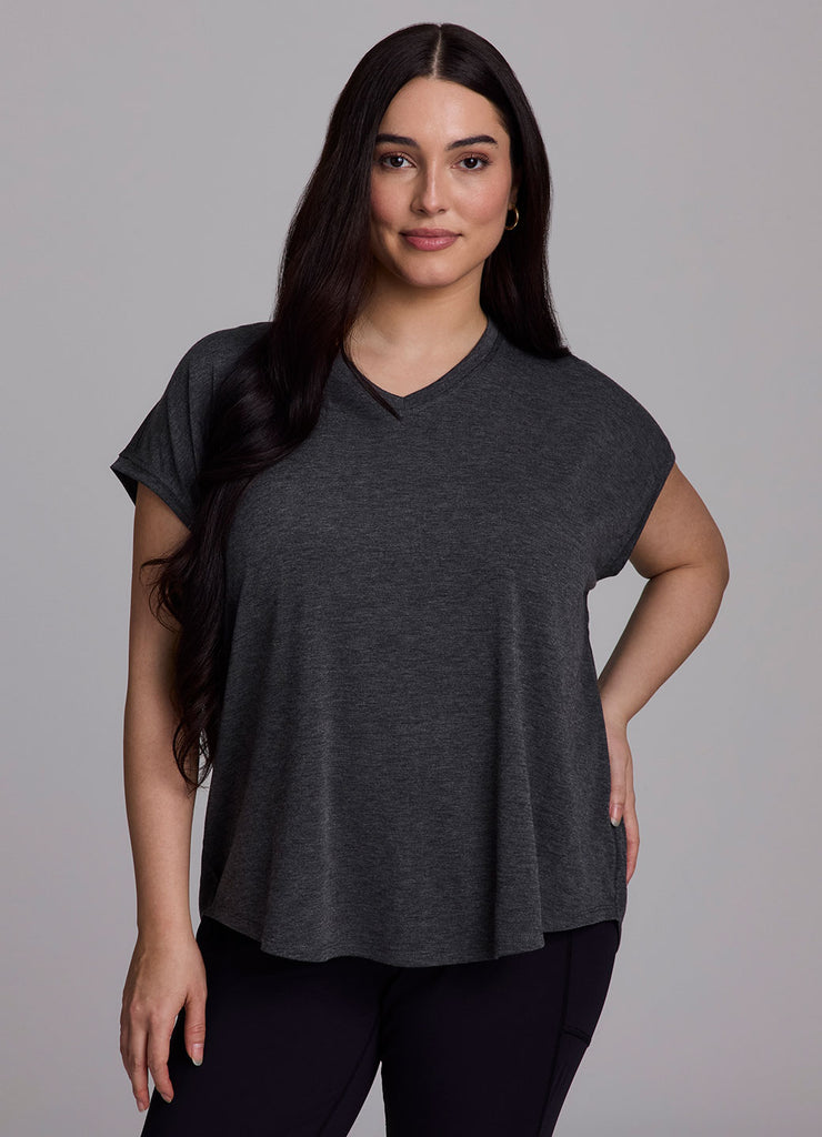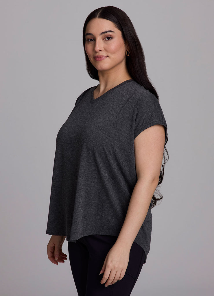 Casual and cute, you need the Plus Breezy Hi Low Tee in your closet. This versatile short sleeve top is made from a soft, heathered jersey fabric and has a relaxed fit. A high/low design offers a longer hemline in back to provide extra coverage and is complemented by a classic V neckline with front seam detail. Whether you pair it with your favorite jeans or throw it on over your sports bra at the yoga studio or gym, you'll reach for this tee again and again.