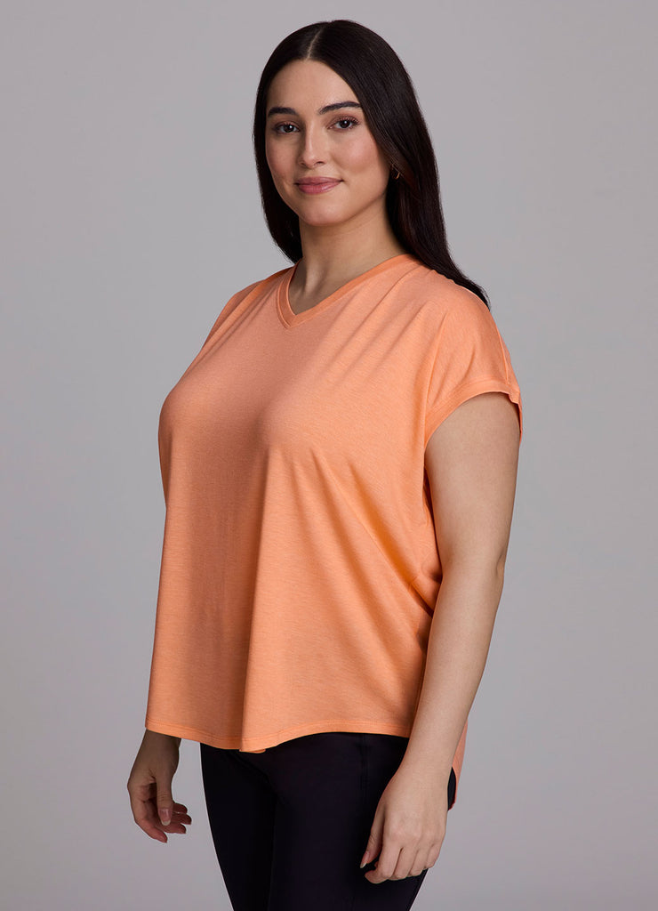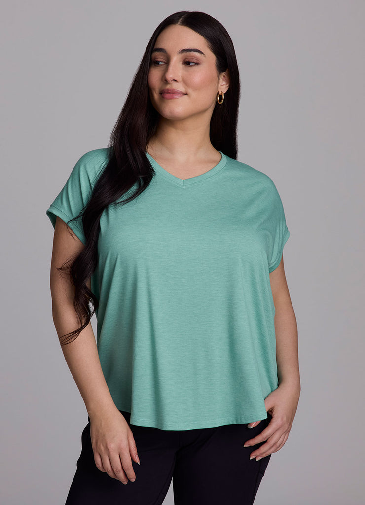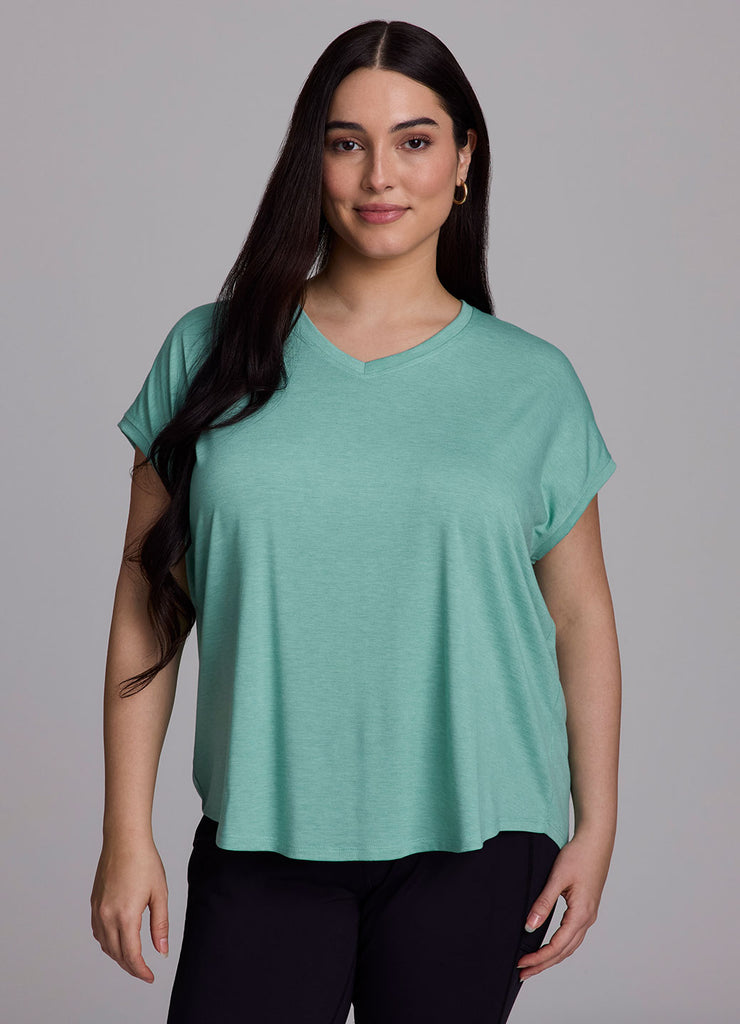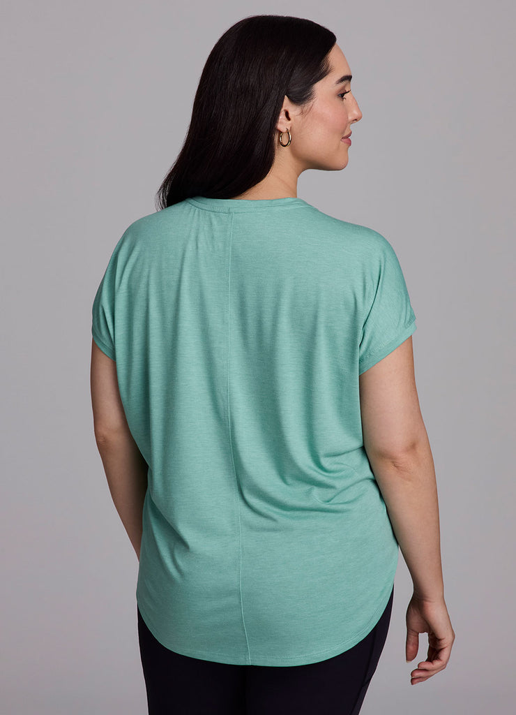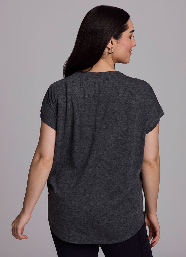 Casual and cute, you need the Plus Breezy Hi Low Tee in your closet. This versatile short sleeve top is made from a soft, heathered jersey fabric and has a relaxed fit. A high/low design offers a longer hemline in back to provide extra coverage and is complemented by a classic V neckline with front seam detail. Whether you pair it with your favorite jeans or throw it on over your sports bra at the yoga studio or gym, you'll reach for this tee again and again.