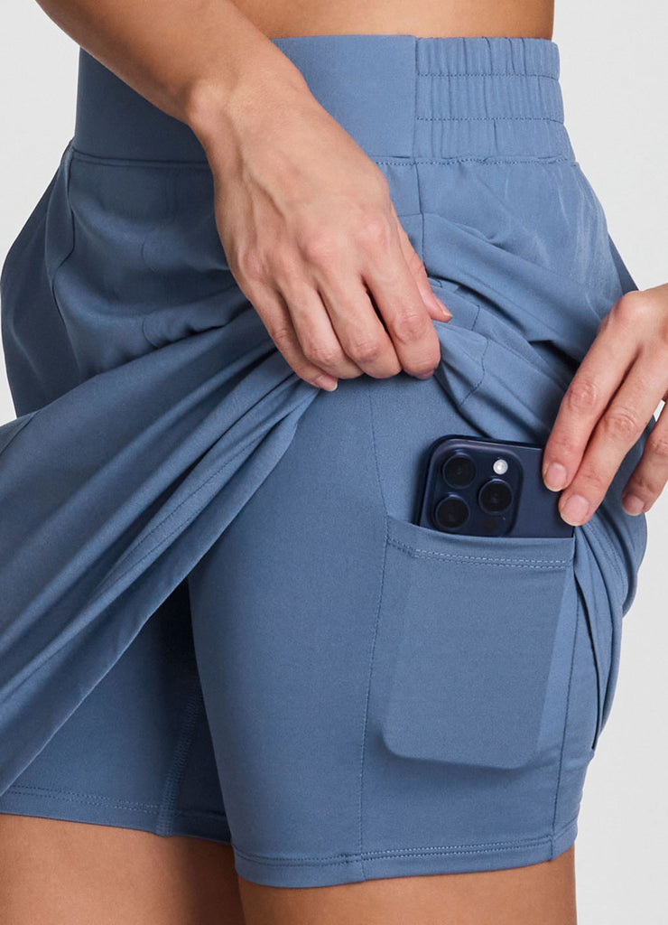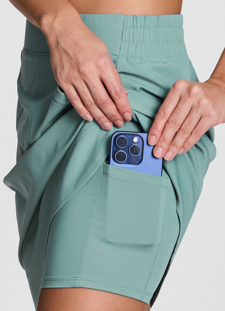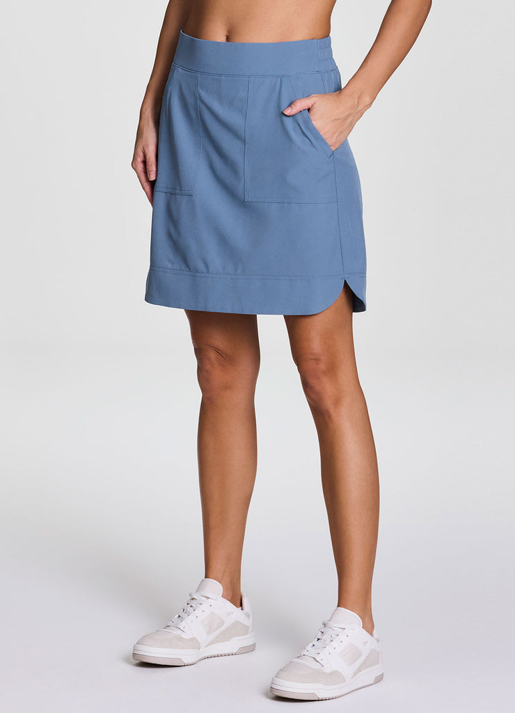 A longer take on our best-selling Prime Everything Skort, you'll love the Prime Everything 19" Skort. This athletic skort is made from a breathable, quick drying, stretch woven material to keep you cool and comfortable. An attached inner bike short underneath with a compression tech pocket keeps you covered, while sizable side pockets provide convenient on-the-go storage for all of your essentials. A wide elastic waist band allows for a perfect fit and lays flat for a streamlined look. Perfect for golf, tennis, running, workouts and travel, this stylish skort will be your favorite new piece in your athleisure wardrobe!