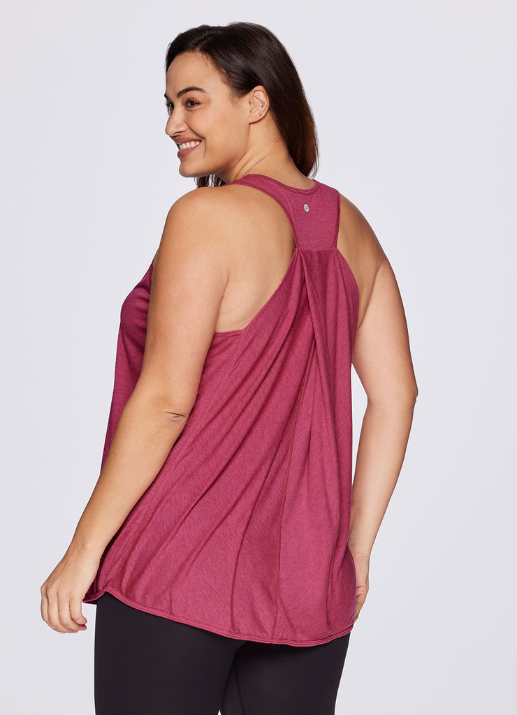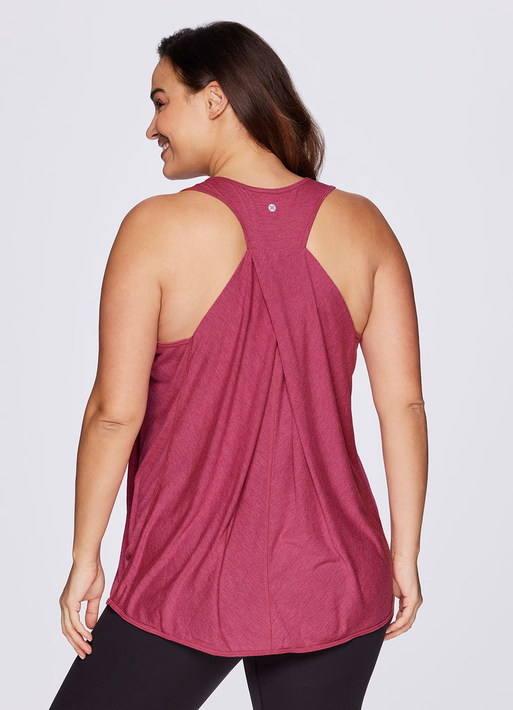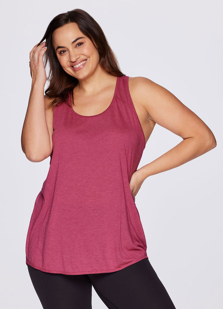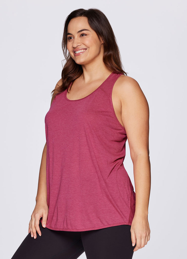 Go beyond the gym in the Plus Prime Relaxed Twist Back Tank Top. This top has a longer length and relaxed fit for extra coverage and comfort. A feminine scoop neckline is paired with a racer back design so that you can power through your workout easily with no restrictions. Constructed from lightweight, soft drapey fabric, this tank is the perfect stand alone piece for any workout or a great layer to throw on while running errands.