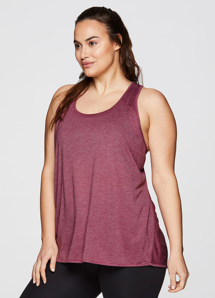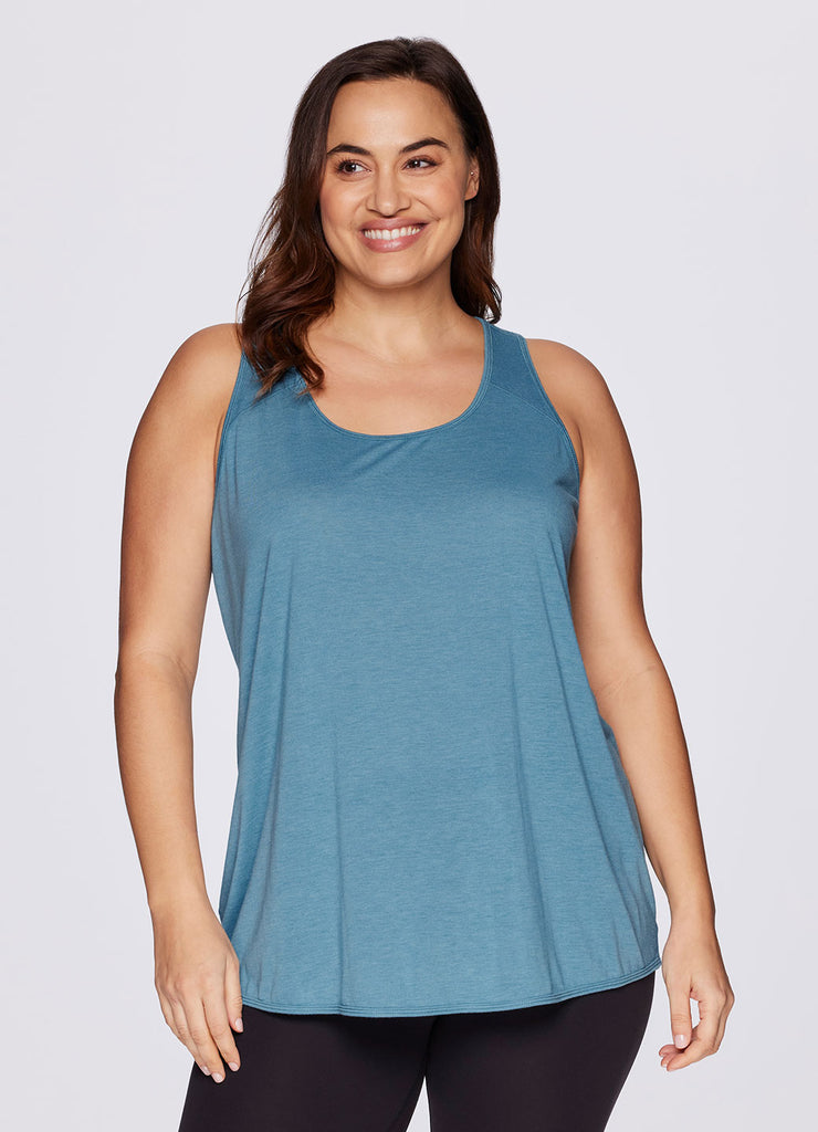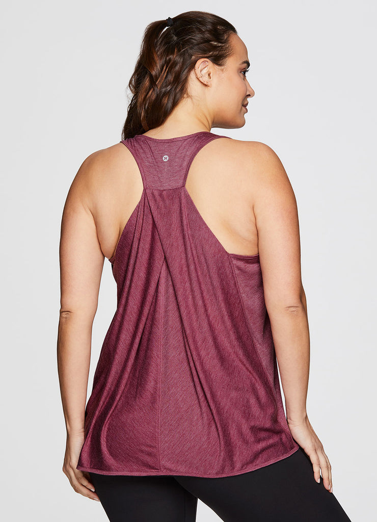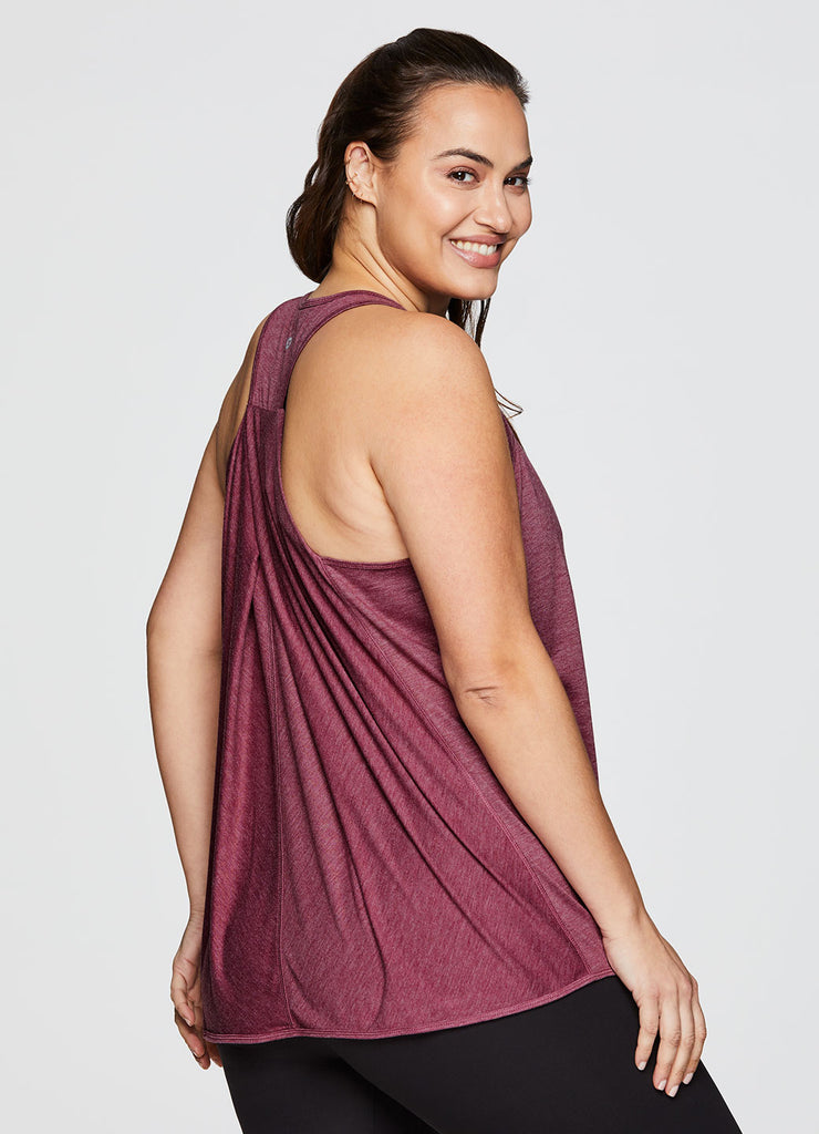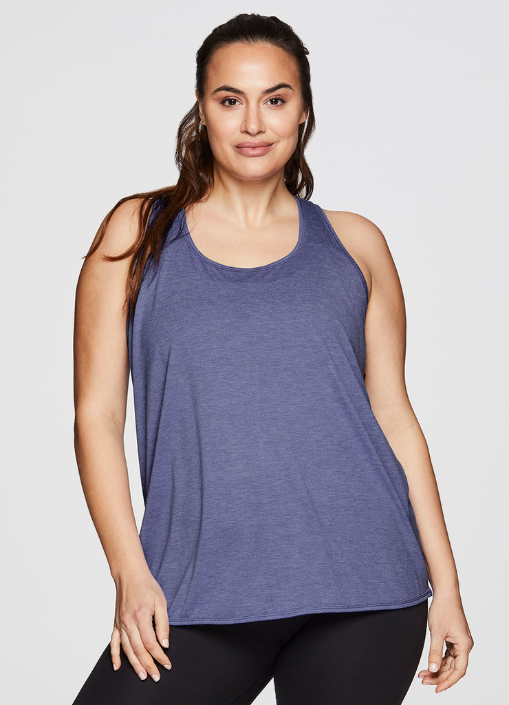 Go beyond the gym in the Plus Prime Relaxed Twist Back Tank Top. This top has a longer length and relaxed fit for extra coverage and comfort. A feminine scoop neckline is paired with a racer back design so that you can power through your workout easily with no restrictions. Constructed from lightweight, soft drapey fabric, this tank is the perfect stand alone piece for any workout or a great layer to throw on while running errands.